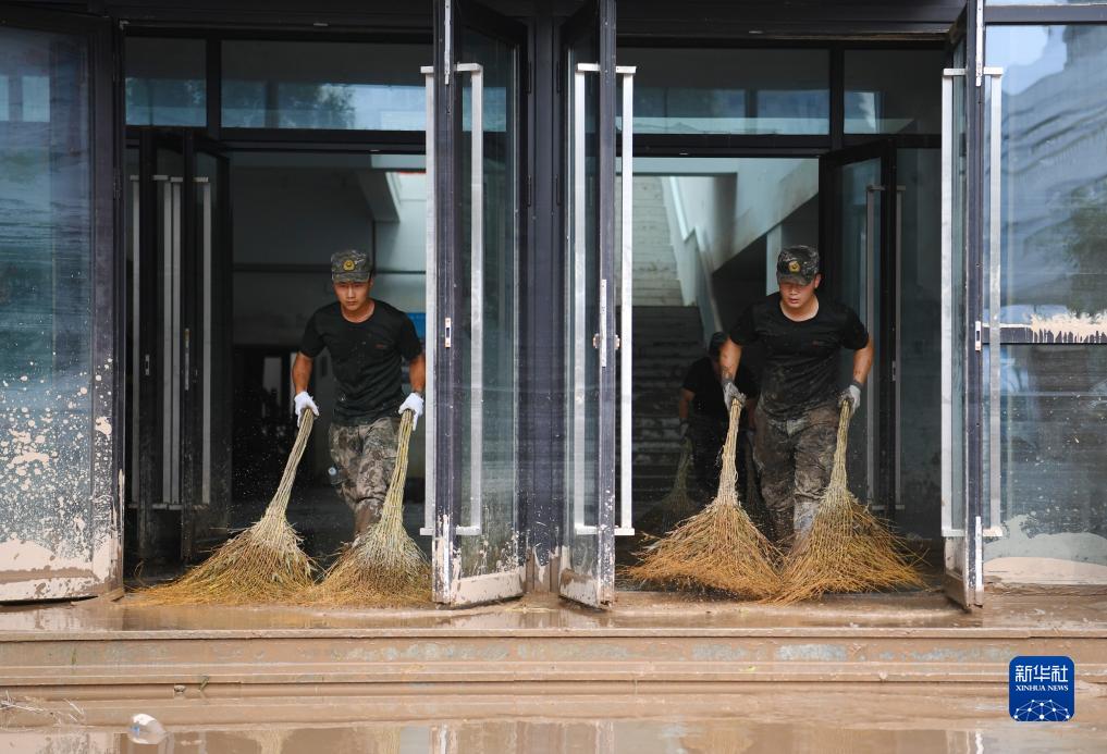 8月10日,武警河北總隊保定支隊戰士在涿州中學教學樓清淤。