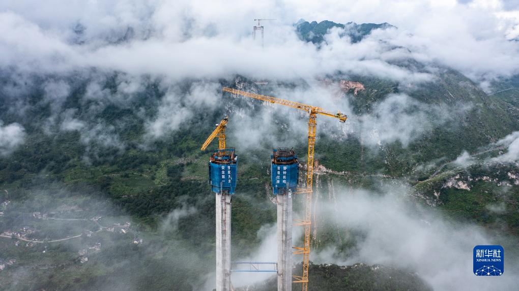 正在修建中的花江峽谷大橋5號主塔(8月3日攝,無人機照片)。