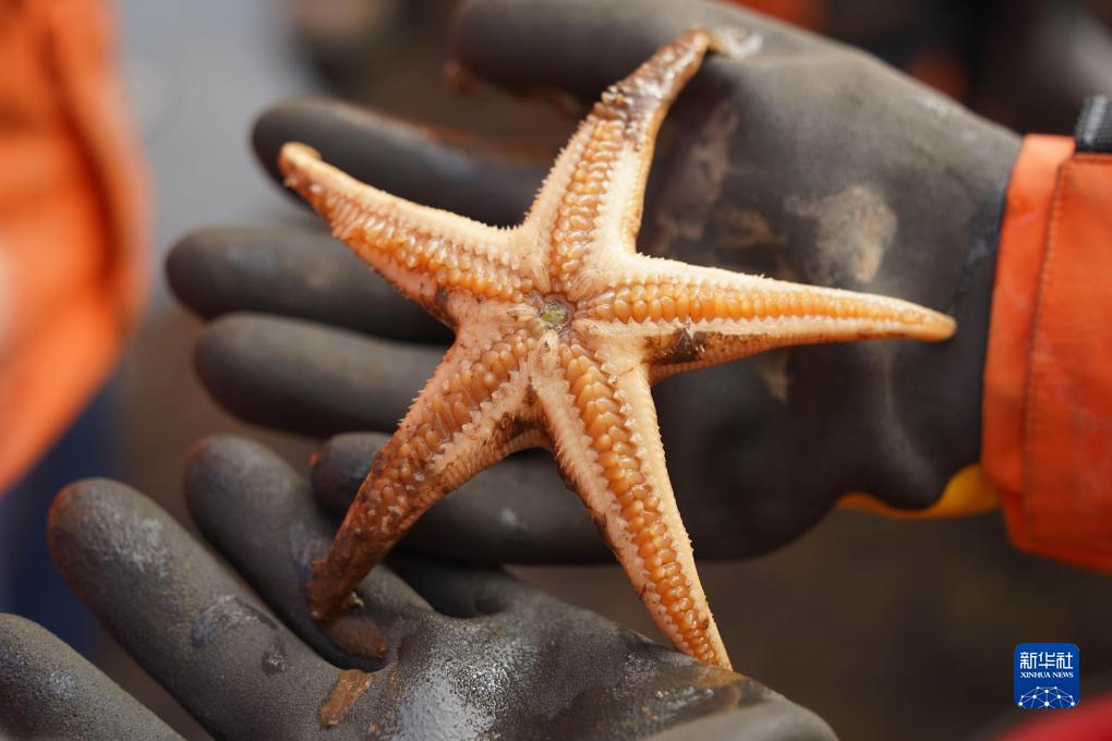 這是在底棲生物拖網作業結束後,科考隊員從樣品中搜索到的海星(8月4日攝)。