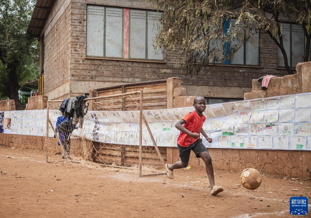 8月11日,在肯尼亞內羅畢的馬薩雷貧民區,兒童在“貧民區嘉年華”活動上踢足球。