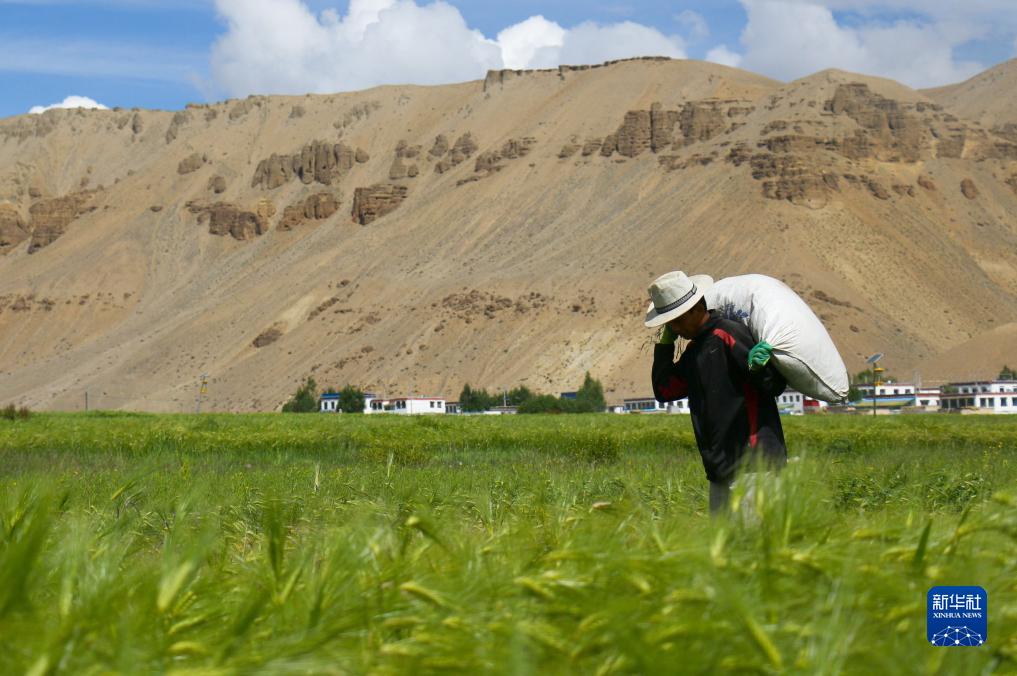 8月12日,西藏阿里地區普蘭縣赤德村村民在青稞田裏勞作。