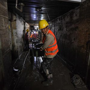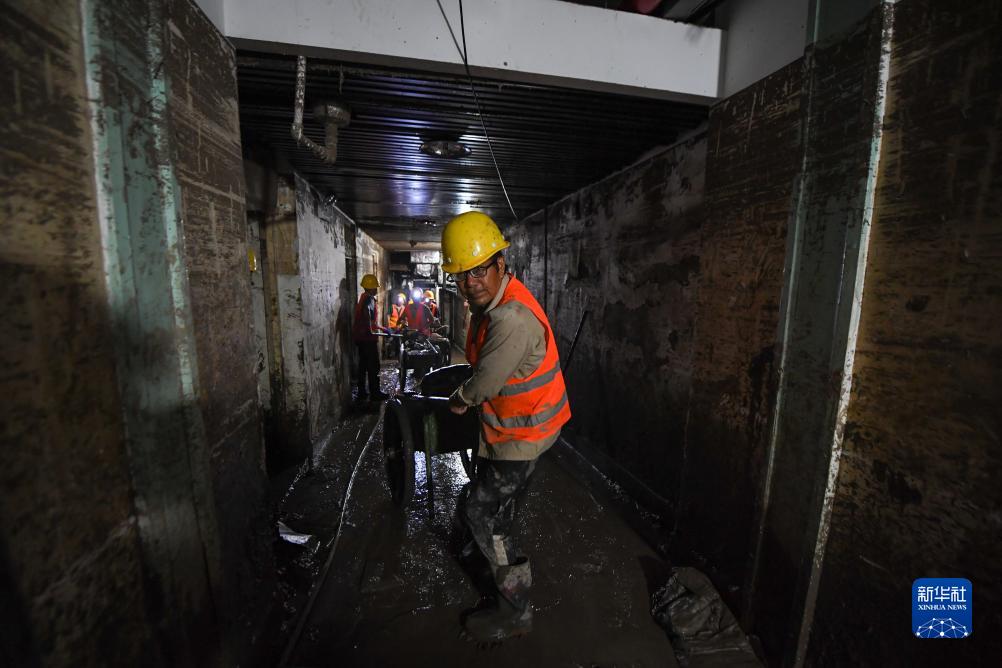 8月12日,在北京市門頭溝區醫院,因水災影響無法從事原本工作的受災群眾組成清淤隊伍,清理醫院地下室的淤泥和垃圾。