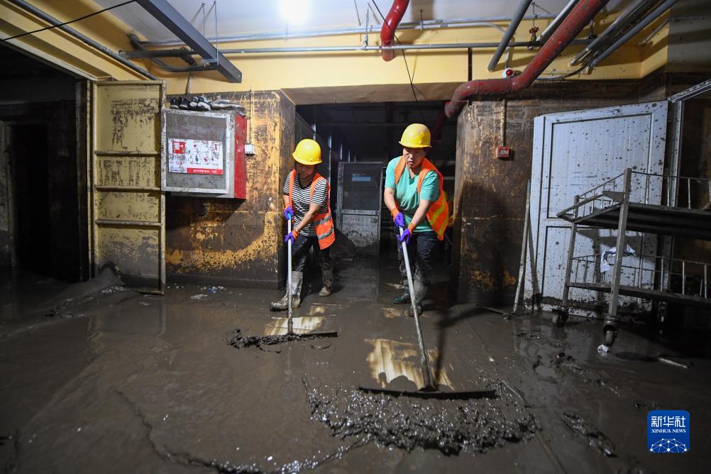 8月12日,在北京市門頭溝區醫院,因水災影響無法從事原本工作的受災群眾組成清淤隊伍,清理醫院地下室的淤泥和垃圾。新華社記者 鞠煥宗 攝