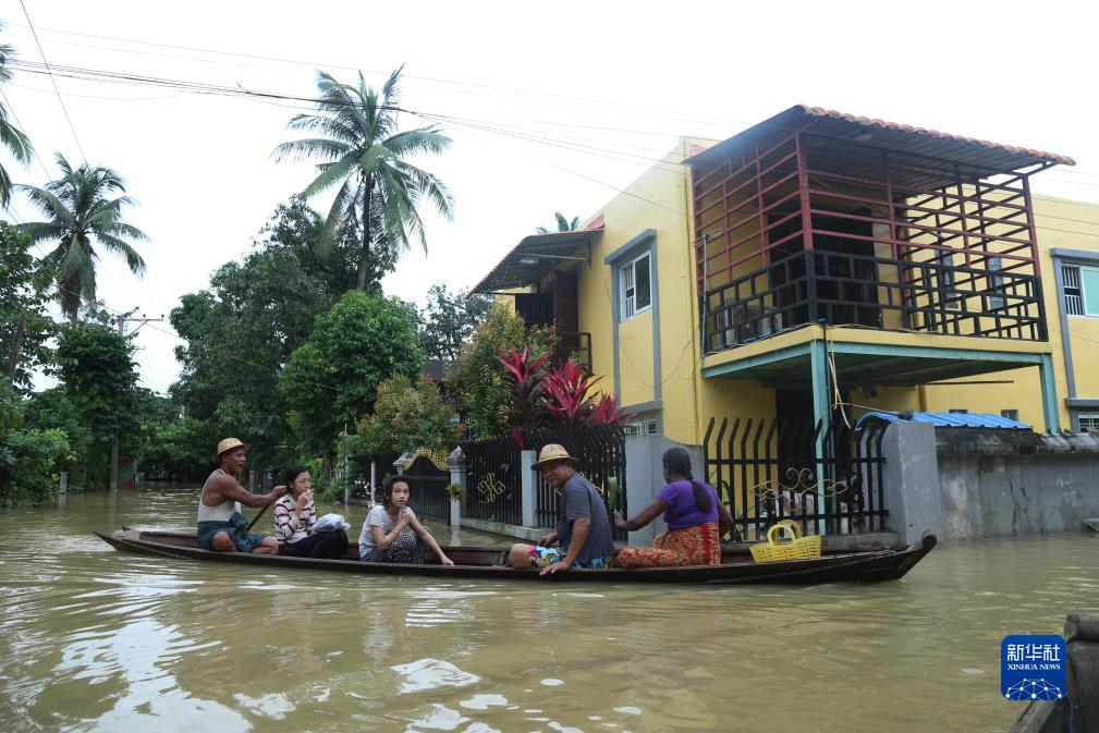 8月12日,在緬甸勃固鎮洪災區,人們乘船出行。新華社發(苗覺梭攝)
