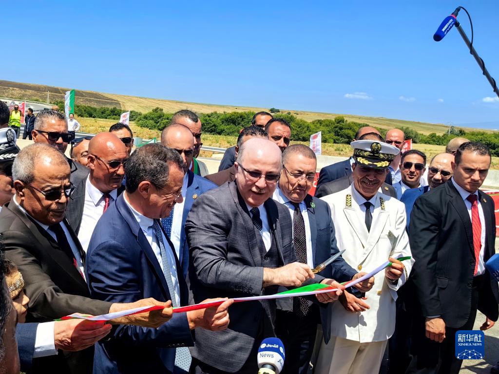 8月12日,在阿爾及利亞塔夫省,阿爾及利亞總理阿卜杜拉赫曼(前左三)出席阿爾及利亞東西高速公路東標段84公里項目通車儀式并剪彩。