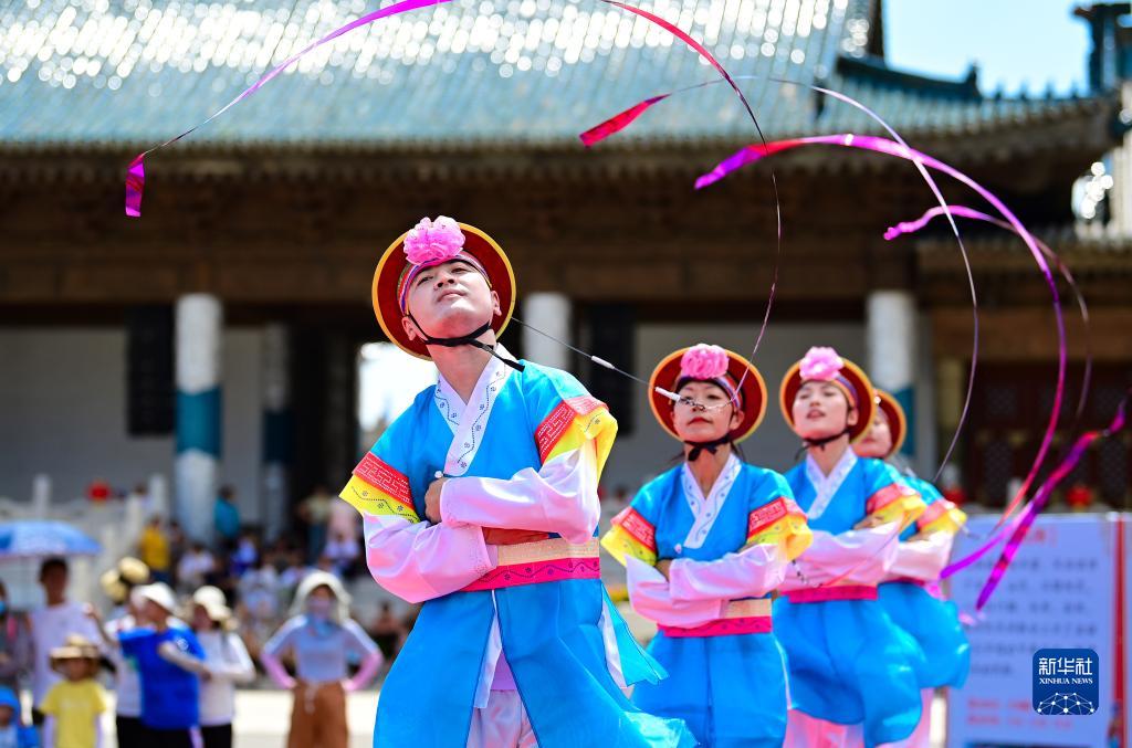 8月13日,在鄂爾多斯文化産業園景區,非遺傳承人表演朝鮮族象帽舞。