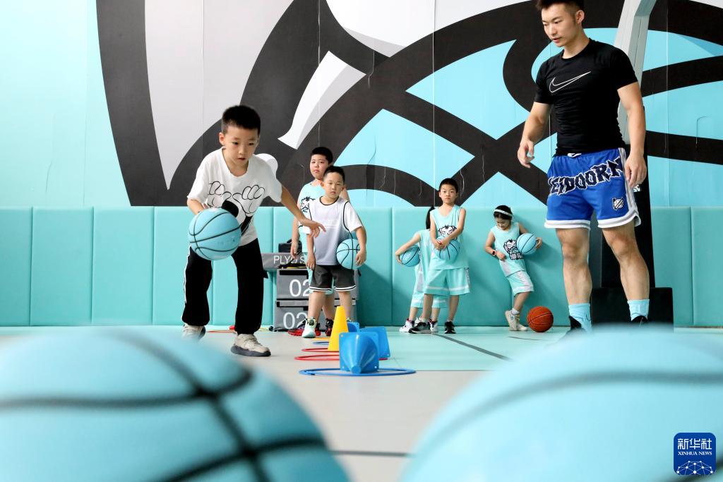 8月13日,青少年在山東省青島市西海岸新區一籃球訓練場練習。