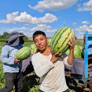8月12日,內蒙古烏審旗無定河鎮河南村農民展示剛摘下的西瓜。