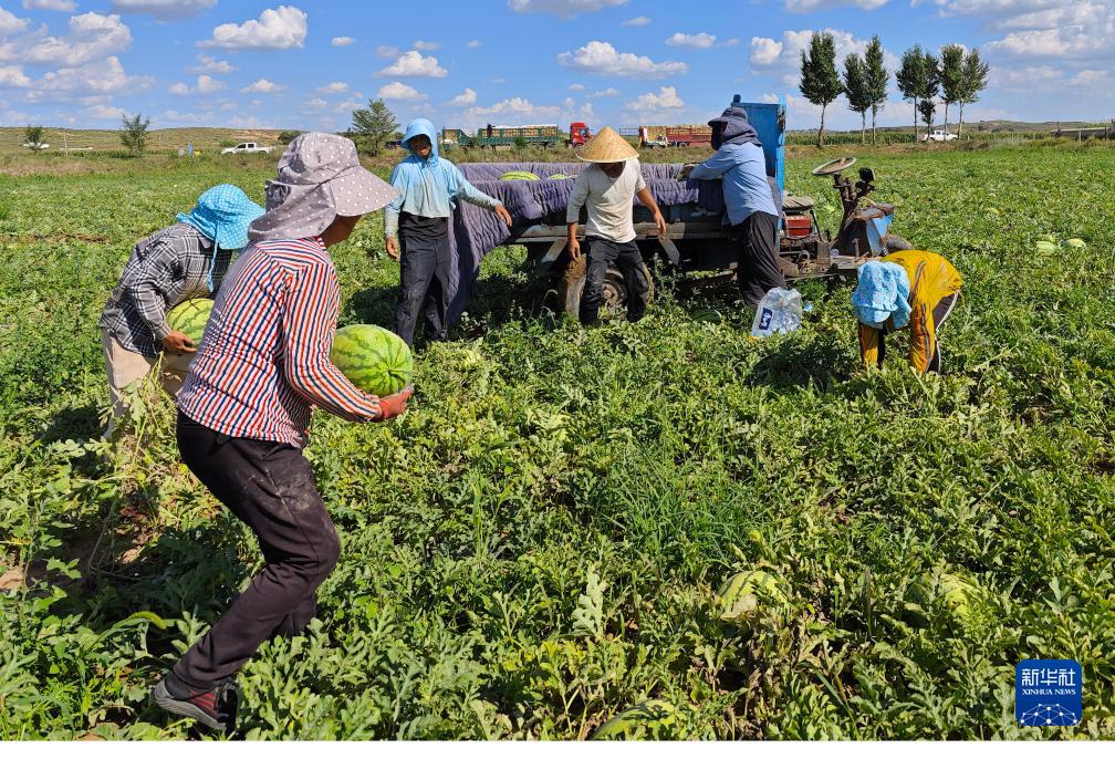 8月12日,內蒙古烏審旗無定河鎮河南村農民在採摘西瓜。