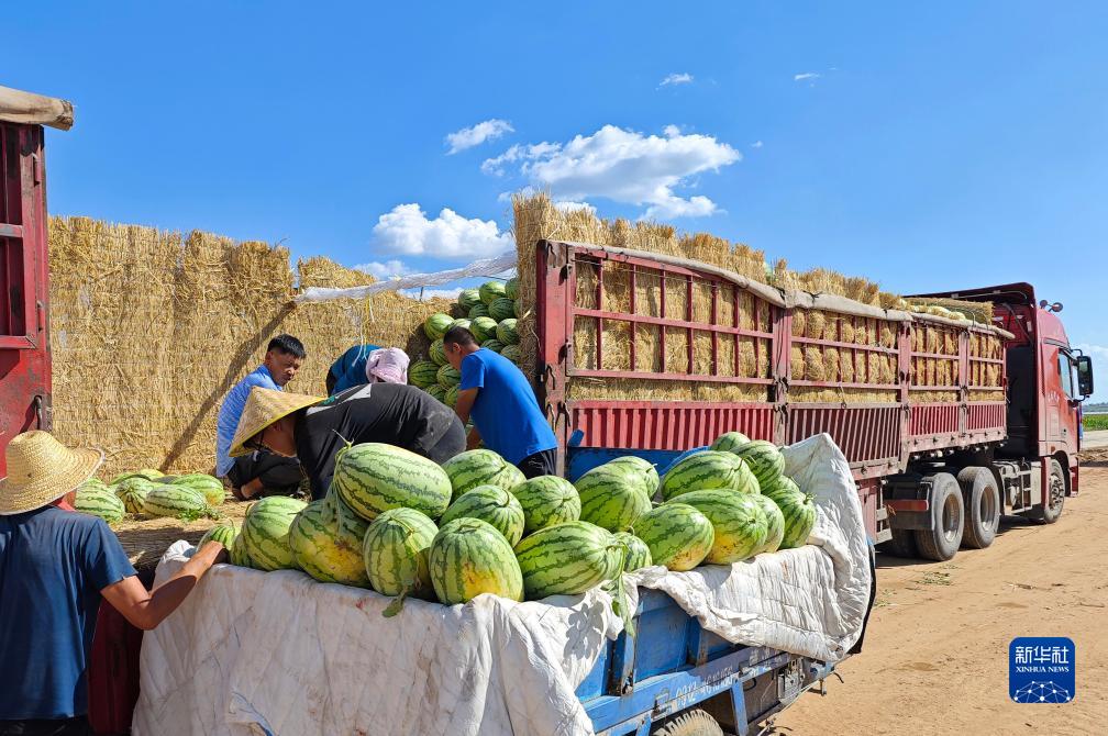 8月12日,內蒙古烏審旗無定河鎮河南村農民將西瓜裝車。