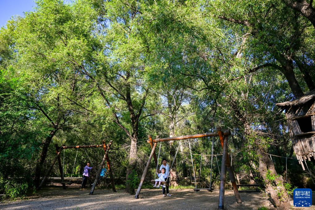 8月13日,小朋友在家長的陪伴下在洮兒河國家濕地公園內玩耍。