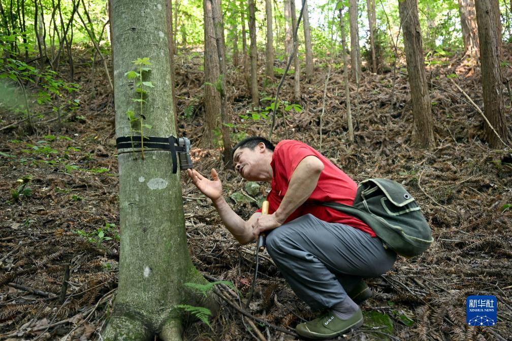 8月12日,在安徽天馬國家級自然保護區天堂寨管理站,王克東在巡山護林途中查看紅外相機的工作情況。