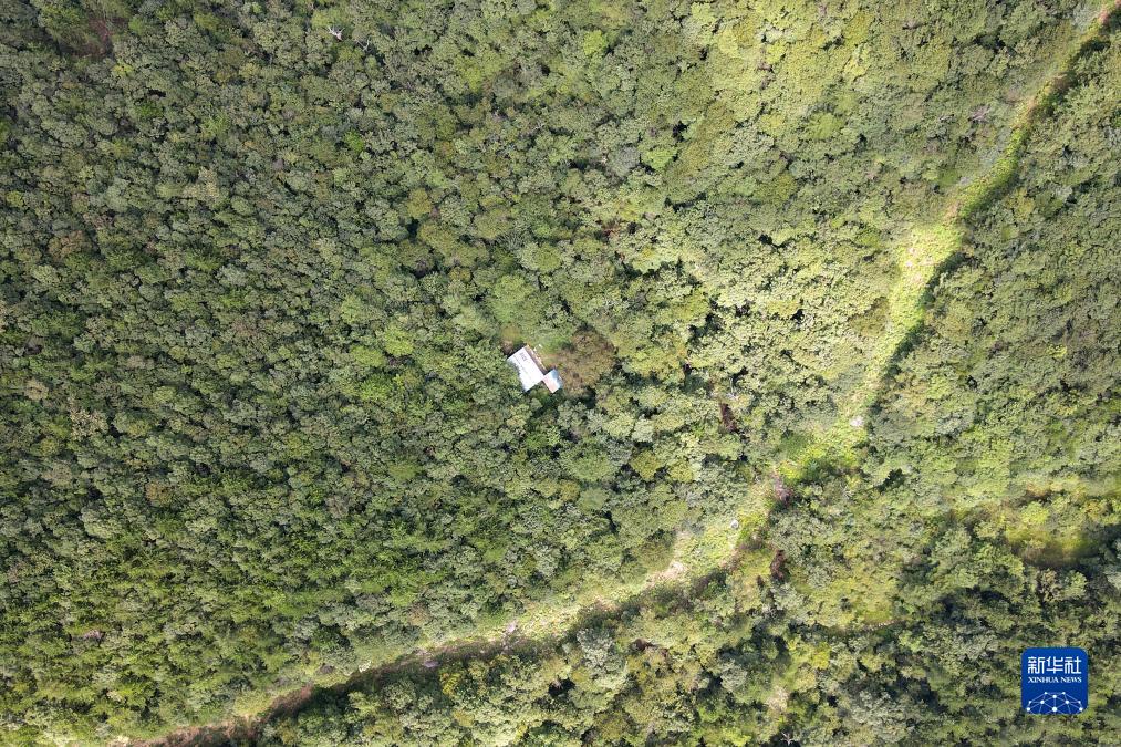 這是8月12日拍攝的安徽天馬國家級自然保護區天堂寨管理站的一處管護站。每年10月1日至次年4月30日的防火關鍵期,王克東夫妻倆會在這裡長期居住(無人機照片)。