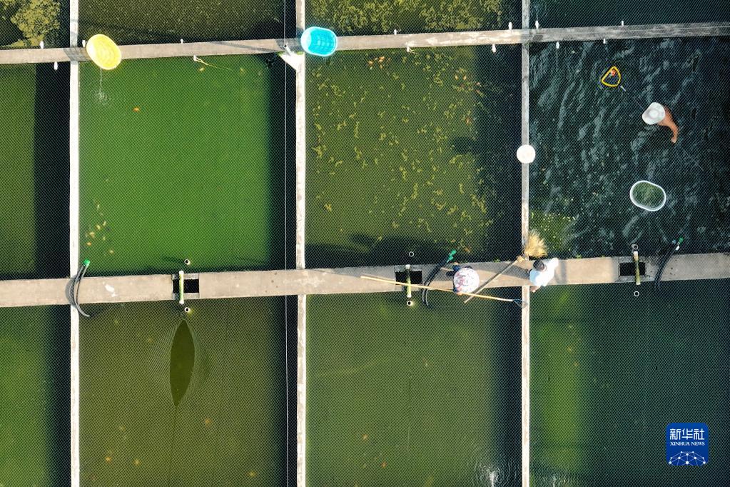在福州市閩侯縣南通鎮古城村春園鯉生態養殖場,養殖戶們在養殖池裏挑選金魚(8月9日攝,無人機照片)。