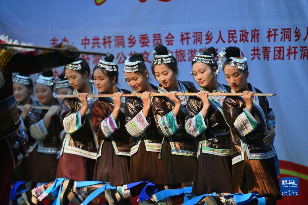 廣西融水苗族自治縣桿洞鄉堯告村的大學生們在參加鄉里的文藝演出(8月1日攝)。