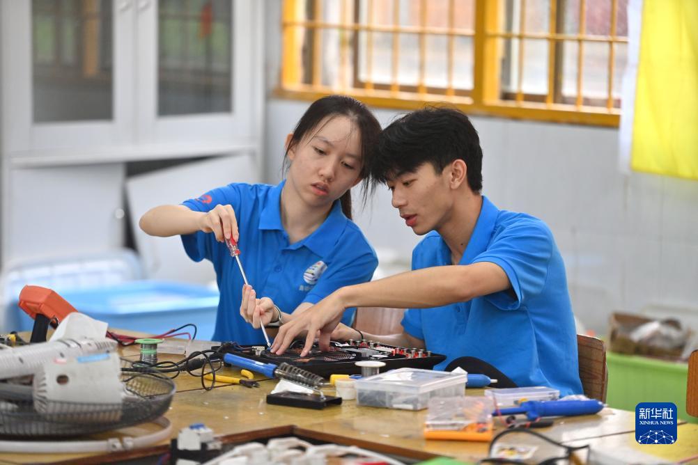 在廣西融安縣泗頂鎮中心小學,廣西科技大學學生黃棟愉(左)和同學在給附近村民維修家電(7月18日攝)。