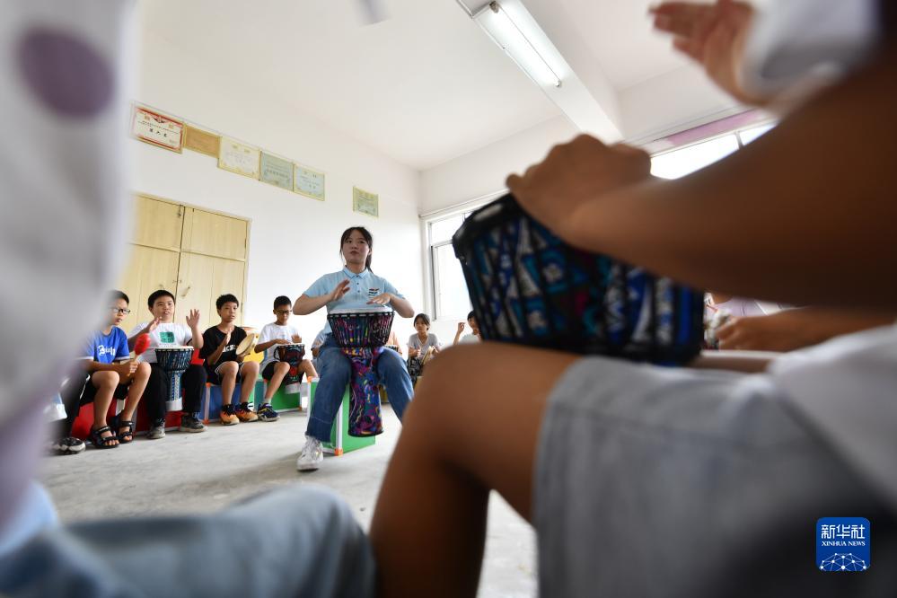 在廣西融安縣泗頂鎮中心小學,廣西科技大學學生彭玥婷在音樂課堂上給小學生上課(7月18日攝)。