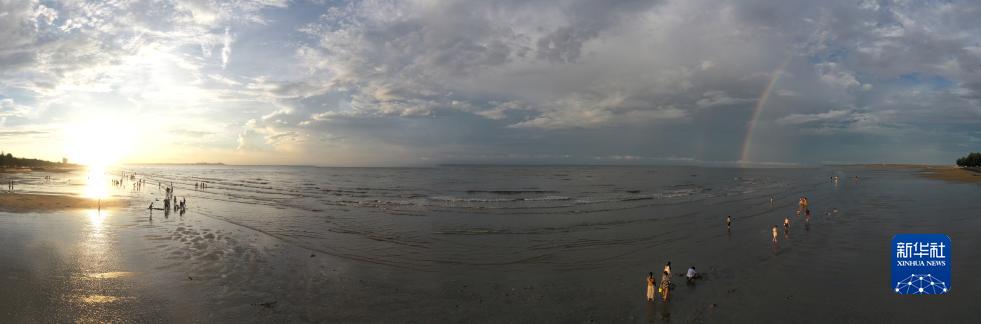 這是廣西東興市金灘朝陽與彩虹“共舞”的景觀(8月14日攝,無人機全景照片)。