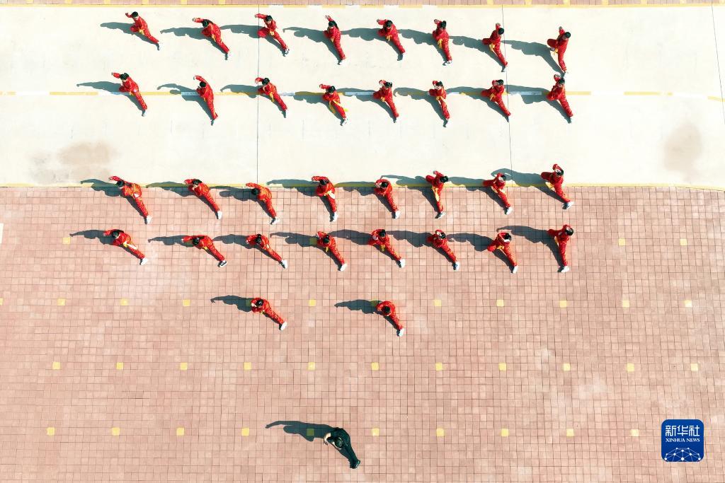 8月14日,在河北省滄州市滄縣汪家鋪鎮董辛莊小學,老師帶領學生習練武術(無人機照片)。