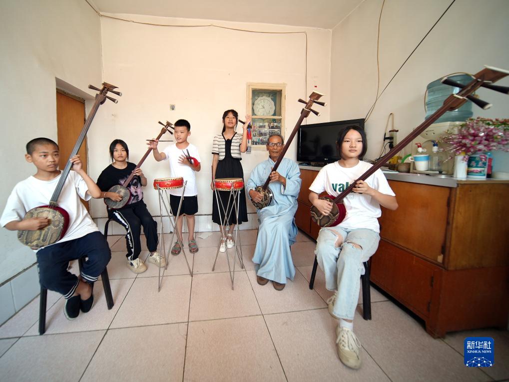 8月14日,在河北省滄州市滄縣舊州鎮後曹莊村,“滄州木板大鼓”國家級非遺傳承人劉銀河(右二)指導學生學習木板大鼓。