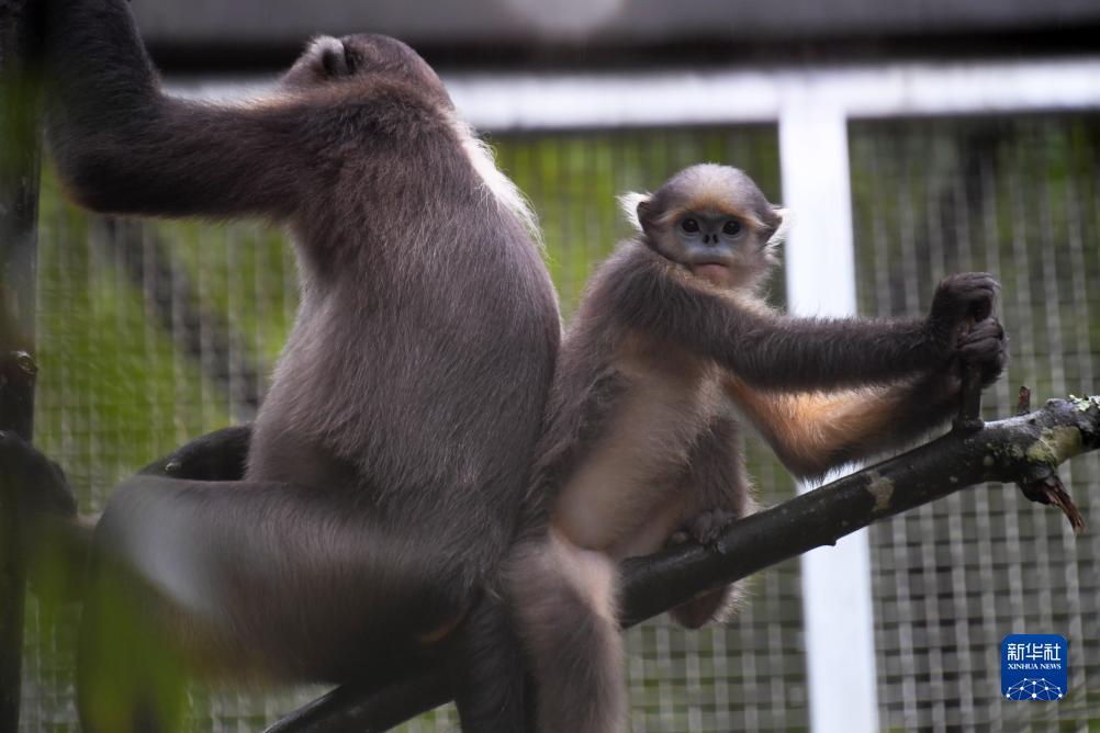 8月14日,兩隻黔金絲猴在梵凈山野生動物救護中心嬉戲。