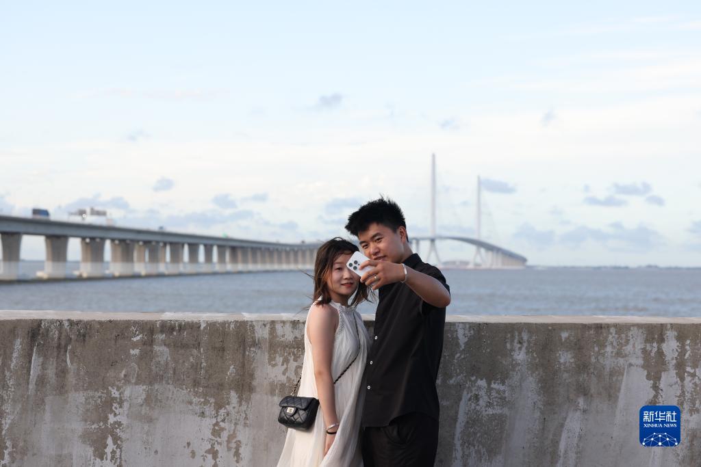 游客以上海長江大橋為背景合影留念(2023年7月25日攝)。