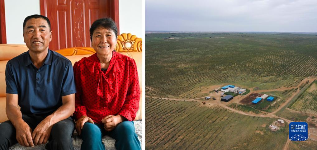這是一張拼版照片。左圖為內蒙古達拉特旗官井村村民周志忠和妻子的合影(8月11日攝);右圖為周志忠位於庫布其沙漠中的房屋(8月11日攝,無人機照片)。周志忠一家人在庫布其沙漠邊緣擁有8000多畝草場。1998年,周志忠開始種植灌木治理沙漠改良草場。