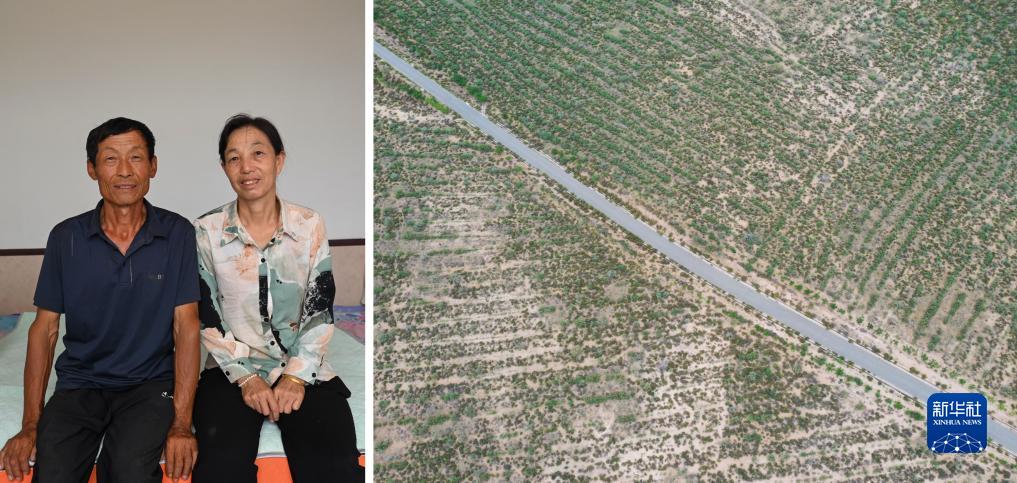 這是一張拼版照片。左圖為內蒙古達拉特旗官井村村民高二雲和妻子的合影(8月11日攝);右圖為高二雲夫妻在庫布其沙漠中種植的檸條(8月11日攝,無人機照片)。今年60歲的高二雲從小便生活在庫布其沙漠中,20世紀80年代開始和父輩們一起種樹治沙。現在他與妻子在沙地裏種植了5000多畝沙柳、檸條。