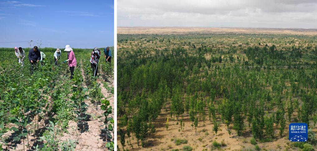 這是一張拼版照片。左圖為內蒙古杭錦旗什拉召治沙站的工作人員在苗圃中除草(7月22日攝);右圖為內蒙古杭錦旗什拉召治沙站種植的庫布其沙漠鎖邊林(7月22日攝,無人機照片)。20世紀50年代開始,國營林場什拉召治沙站開始植樹治沙,三代治沙人在庫布其沙漠北緣營造了長48公里、面積12萬多畝的鎖邊林帶,有效遏制了沙漠向北擴張。