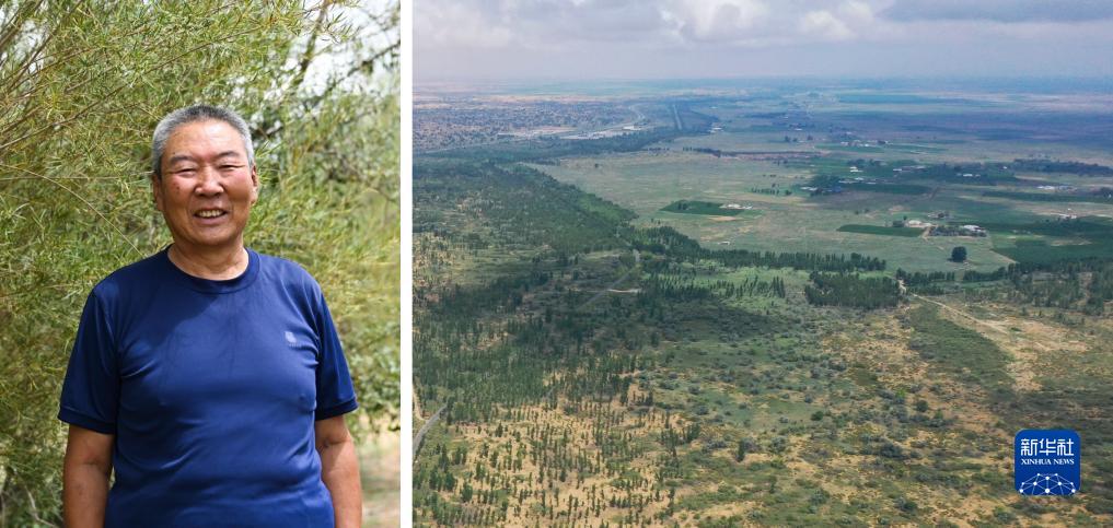這是一張拼版照片。左圖為內蒙古杭錦旗道圖嘎查原支部書記陳寧布在自家草場留影(7月21日攝)。右圖為內蒙古杭錦旗道圖嘎查的植被(7月21日,無人機照片)。內蒙古杭錦旗道圖嘎查地處庫布其沙漠邊緣,過去生態環境惡劣。作為一名基層黨員,陳寧布不僅綠化了自家近千畝草場,還帶動農牧民一起綠化草場。