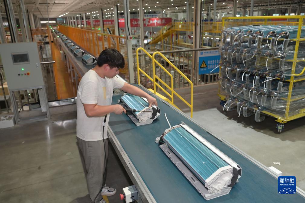 8月14日,在格力電器(贛州)有限公司,工人在空調生産線上工作。