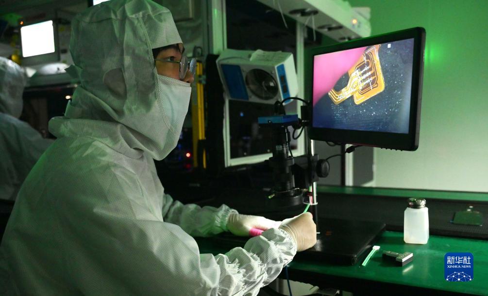 8月14日,在贛州市同興達科技有限公司(金鳳梅園廠區),工作人員在用顯微鏡檢驗産品是否存在焊接不良。