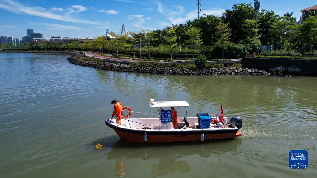 環衛工人在海口灣內作業(無人機照片,8月9日攝)。