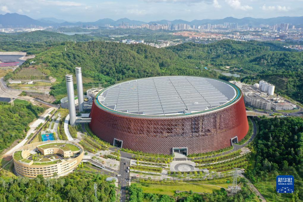 深圳龍崗能源生態園佔地面積約54萬平方米,日處理生活垃圾5000噸,是目前國內單體建設規模最大的超大型生活垃圾焚燒處理設施,園區內配套建設科普教育基地及餐飲服務,未來將對市民開放(無人機照片,8月8日攝)。
