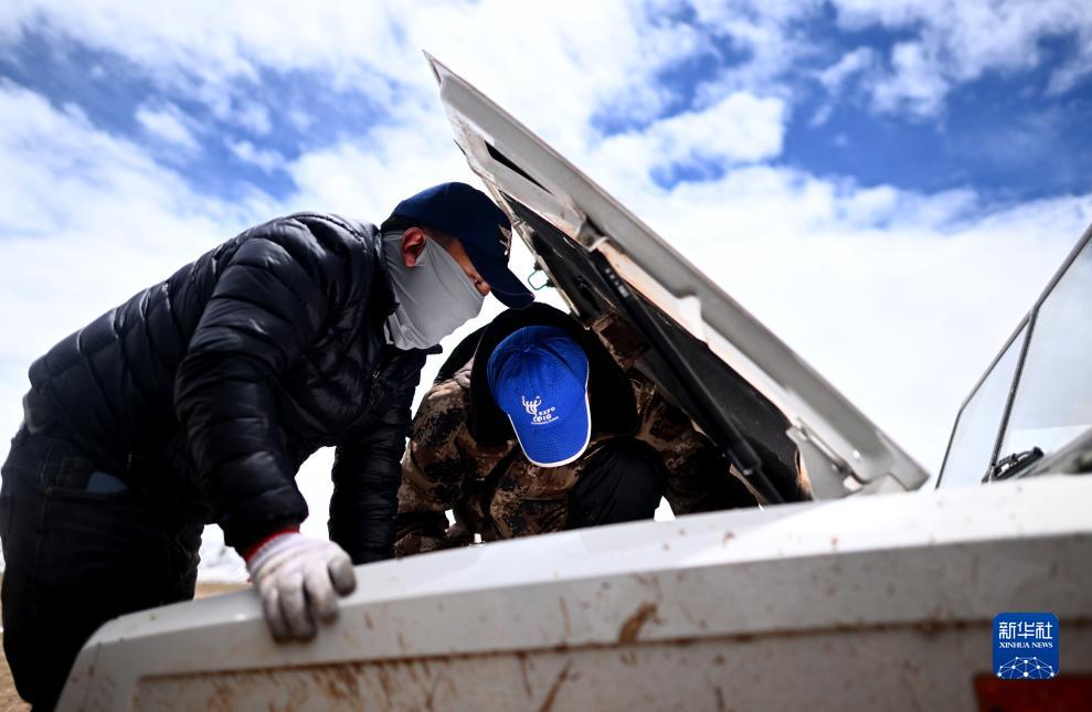在前往卓乃湖保護站的途中,可可西裏管理處卓乃湖保護站隊員才索加(左)和隊友在維修出現故障的車輛(6月16日攝)。