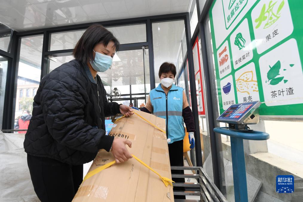 在湖州吳興區八里店鎮西湖漾社區再生資源回收站,居民將廢舊紙板帶來稱重回收,現場結算現金(2023年2月22日攝)。