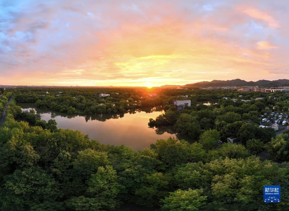 杭州市西溪濕地日出景觀(7月31日攝,無人機照片)。