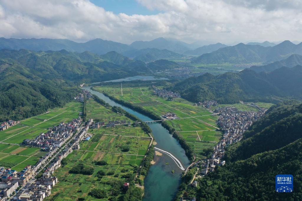 在浙江省衢州市開化縣拍攝的錢塘江源頭河——馬金溪及沿岸村莊。當地最大限度地保留流域灘地灘林,將“固堤+綠岸+慢道”結合建設,帶動鄉村旅游和民宿經濟大力發展(8月2日攝,無人機照片)。