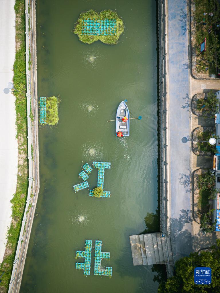 工作人員駕駛小船在寧波市江北區西大河上清理水面(8月11日攝)。近年來,寧波市江北區通過堤岸整治、河道清淤、建立微循環系統等方式,提高了西大河的水體自凈能力和水生態環境。