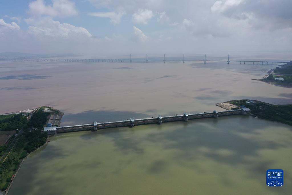 曹娥江大閘是我國強涌潮河口地區第一大閘,浙東水資源配置重要樞紐工程(8月4日攝,無人機照片)。
