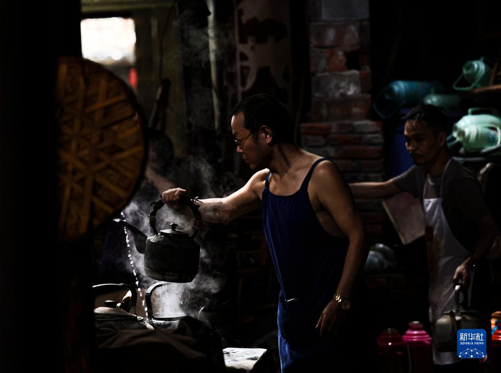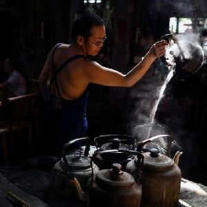 老闆李強(左)和夥計為客人準備沏茶的開水(8月7日攝)。