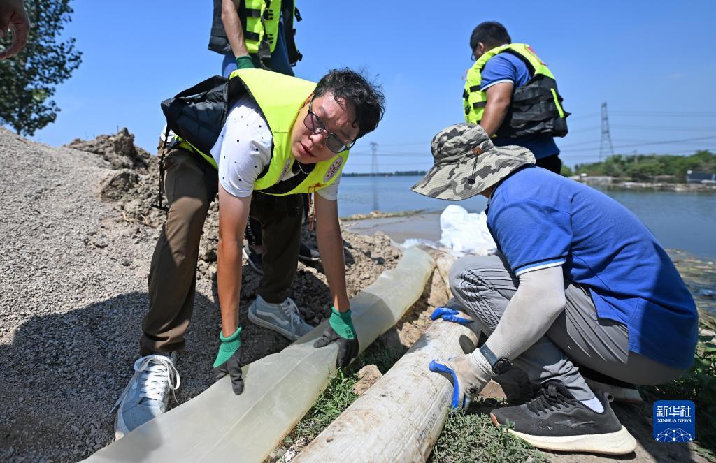 8月15日,應急搶險隊在天津市靜海區&頭鎮清北地區北圍埝上調整抽水袋。