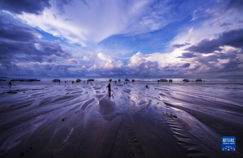 清晨,迅速變化的光線和雲彩、來來往往的游客、聞雞起舞的漁人以及奔騰不息的波浪,在廣西東興的金灘上一起奏響了一首美妙的樂曲。