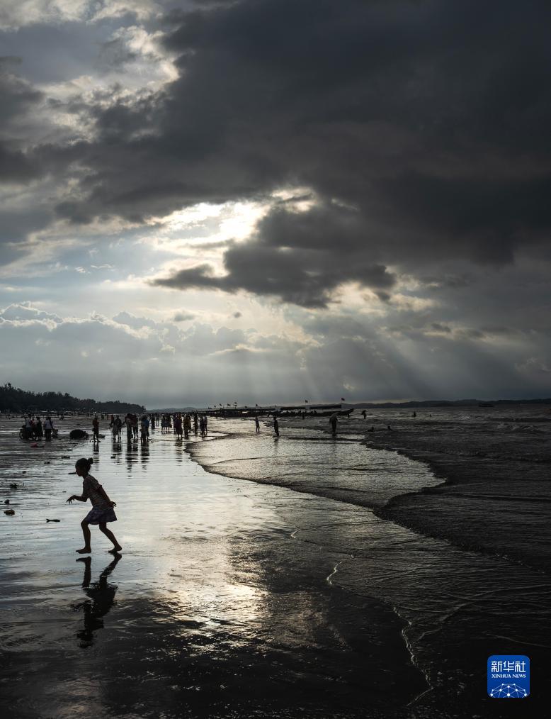 清晨,迅速變化的光線和雲彩、來來往往的游客、聞雞起舞的漁人以及奔騰不息的波浪,在廣西東興的金灘上一起奏響了一首美妙的樂曲。