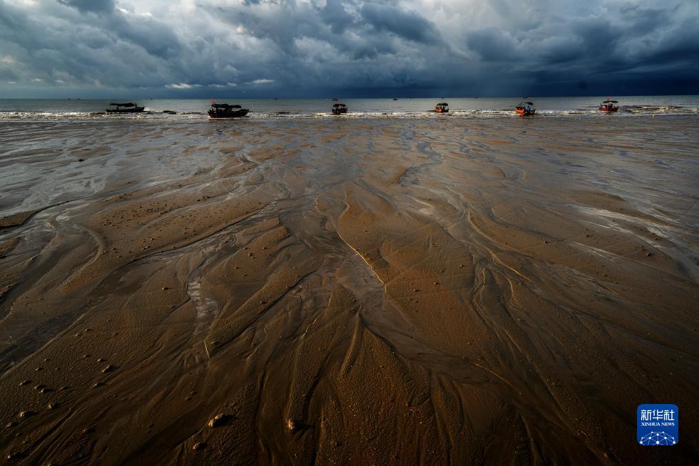 清晨,迅速變化的光線和雲彩、來來往往的游客、聞雞起舞的漁人以及奔騰不息的波浪,在廣西東興的金灘上一起奏響了一首美妙的樂曲。