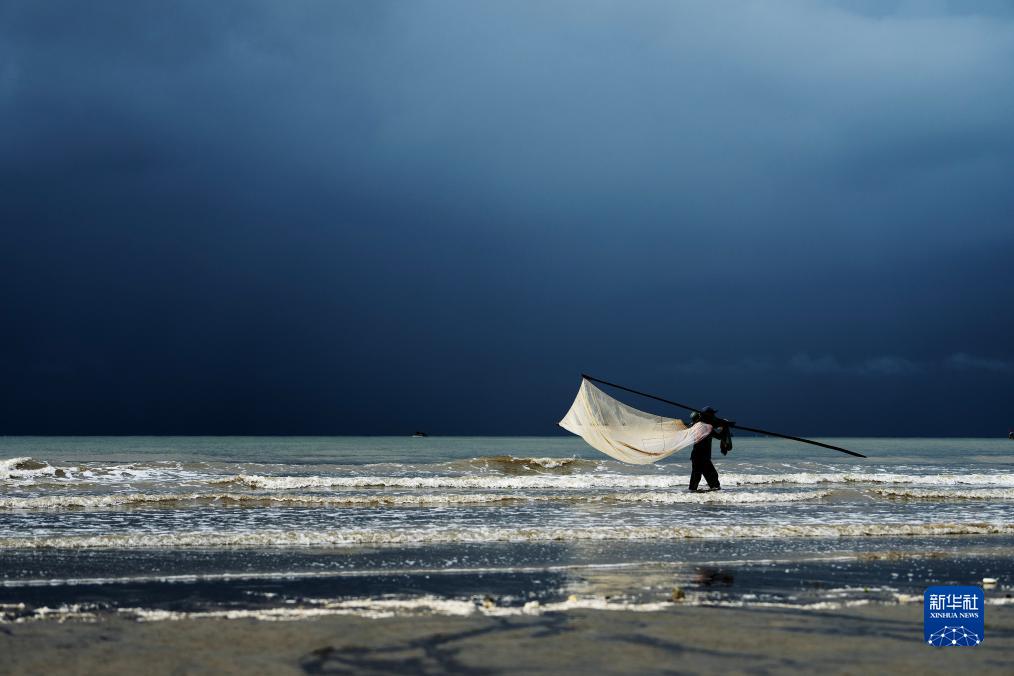 清晨,迅速變化的光線和雲彩、來來往往的游客、聞雞起舞的漁人以及奔騰不息的波浪,在廣西東興的金灘上一起奏響了一首美妙的樂曲。