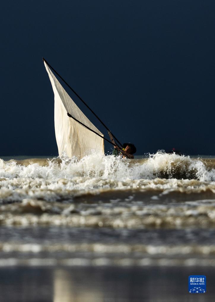 清晨,迅速變化的光線和雲彩、來來往往的游客、聞雞起舞的漁人以及奔騰不息的波浪,在廣西東興的金灘上一起奏響了一首美妙的樂曲。