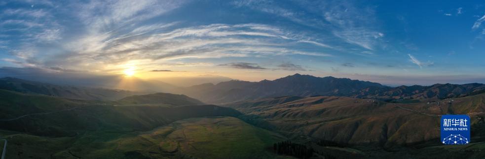 夕陽映照下的新疆昌吉市廟爾溝鄉索爾巴斯陶牧場(8月13日攝,無人機全景照片)。