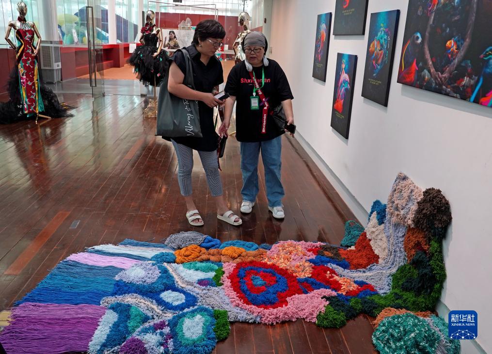 藝術節現場展示的手工作品《青山綠水》(8月15日攝)。該作品由設計師和海派鉤針編結非遺傳承人共同創作,呼籲人們保護山河草木。