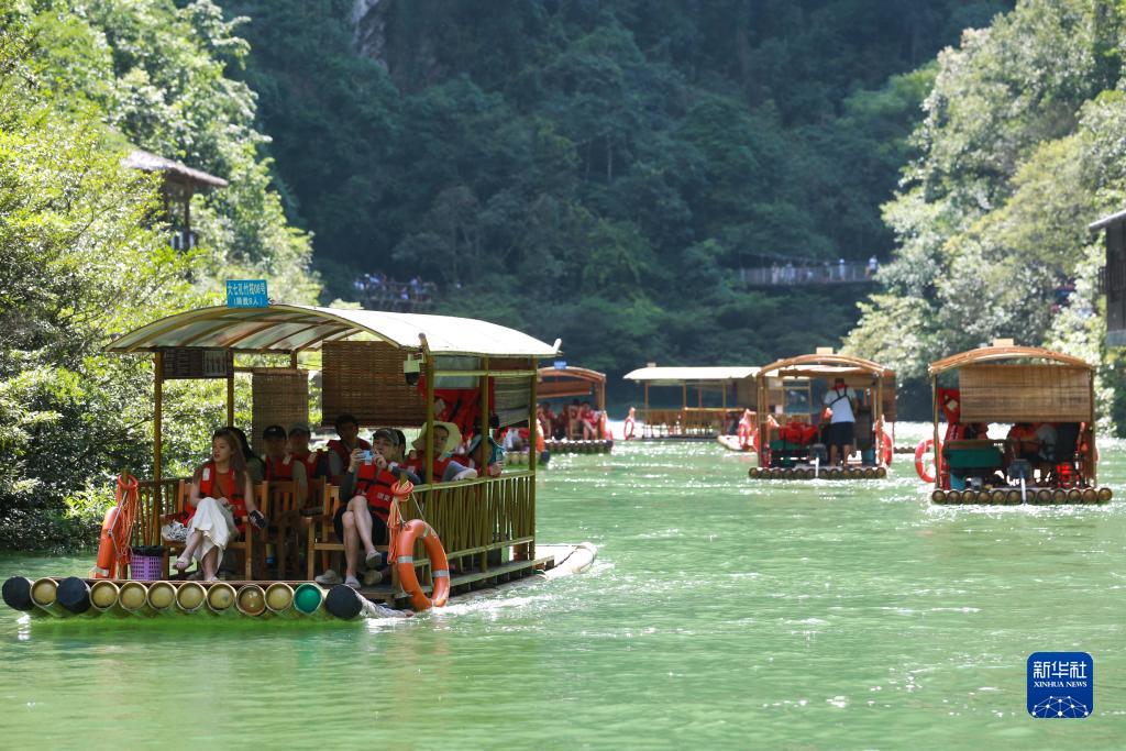 8月15日,游客在貴州省荔波小七孔風景區乘船游玩。